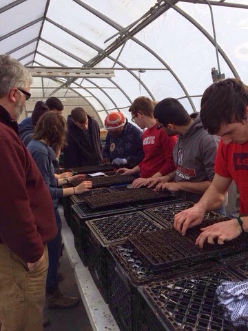 Below: Our group placing small green cabbage seeds in rows of soil.